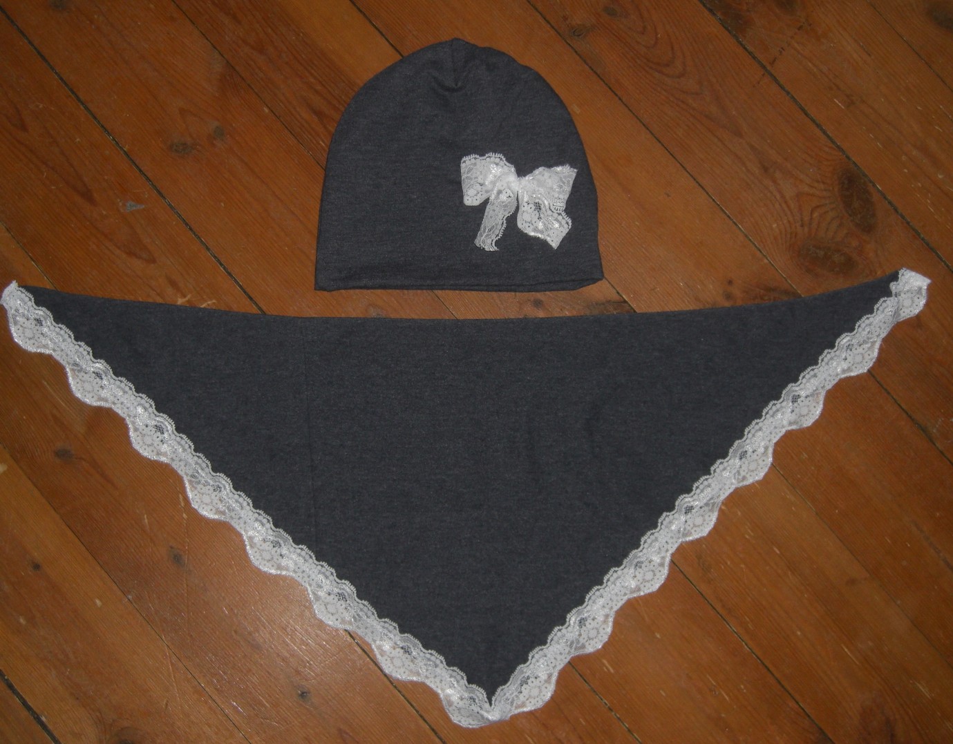 Jag har inte bestämmt mig för om jag tycker om det eller ej... iaf ett set med sjal och mössa strl 8år,egna mönster. Jeansfärgad jersey från jny och stretch spets fr usa.